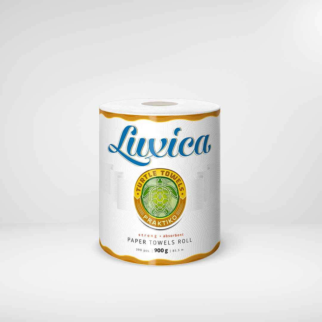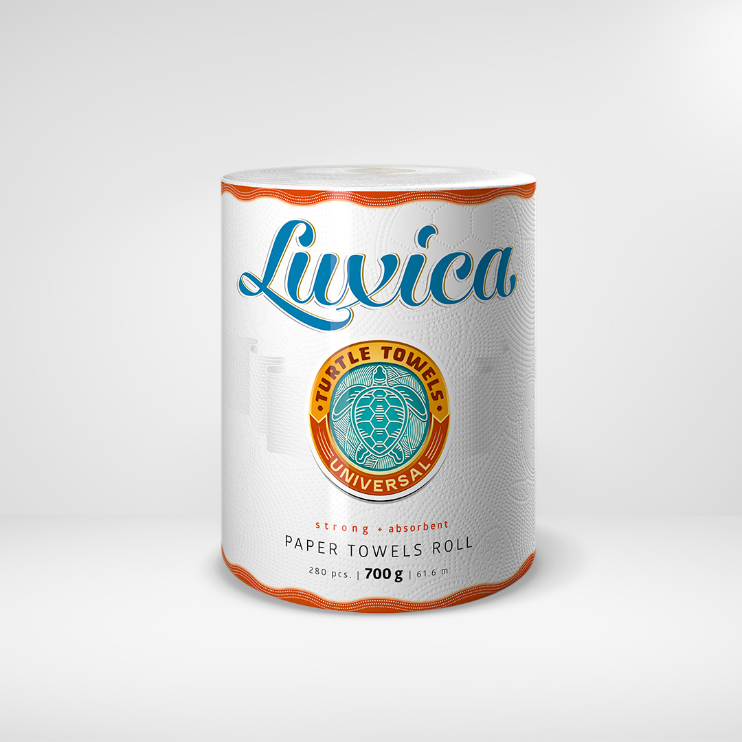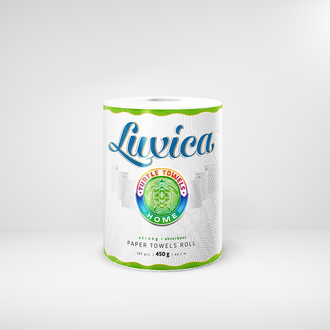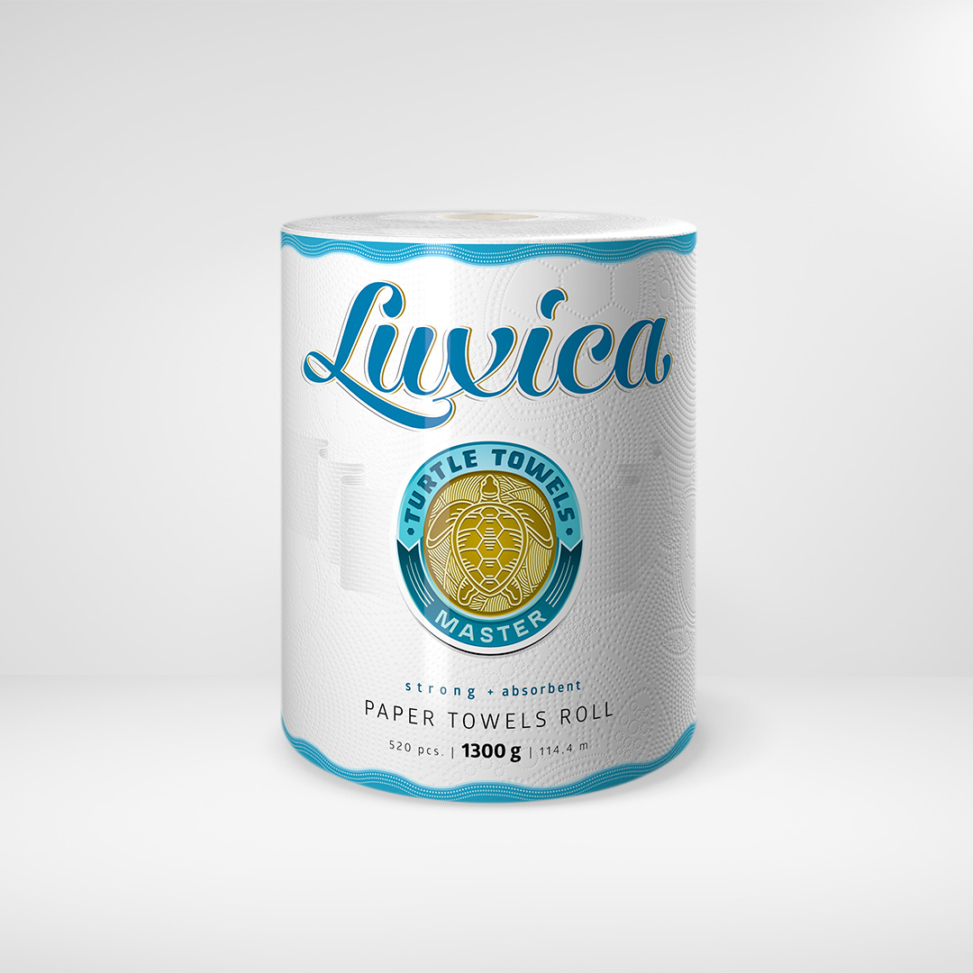 Concept and packaging design for individually packed kitchen paper rolls of Luxica “Turtle Towels” domestic range of products. Luxica
